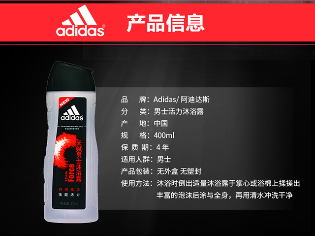 阿迪达斯(Adidas)男士能量沐浴露400ml 持久留香控油清凉舒爽