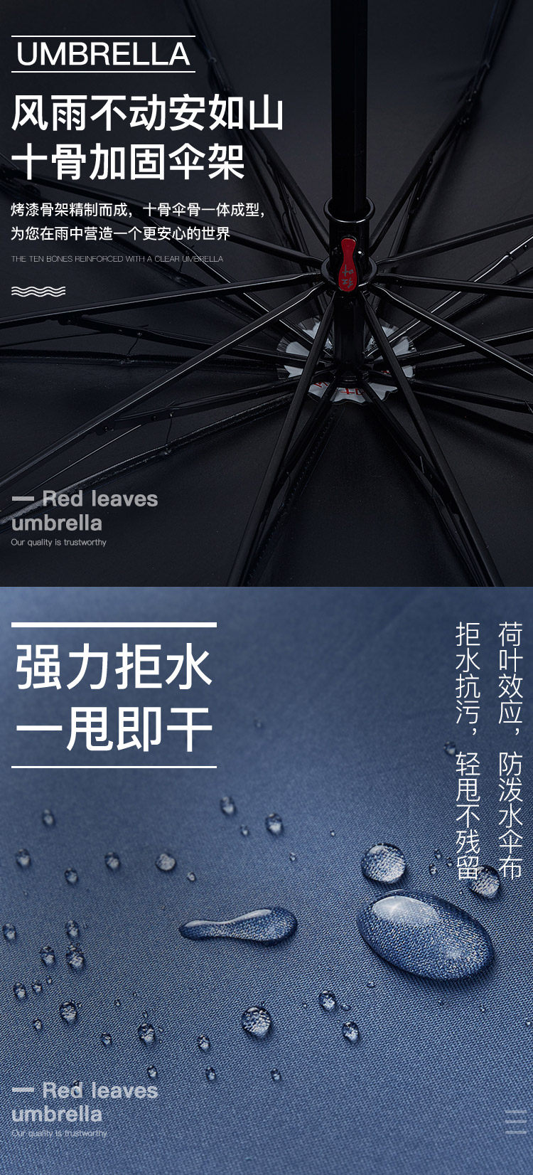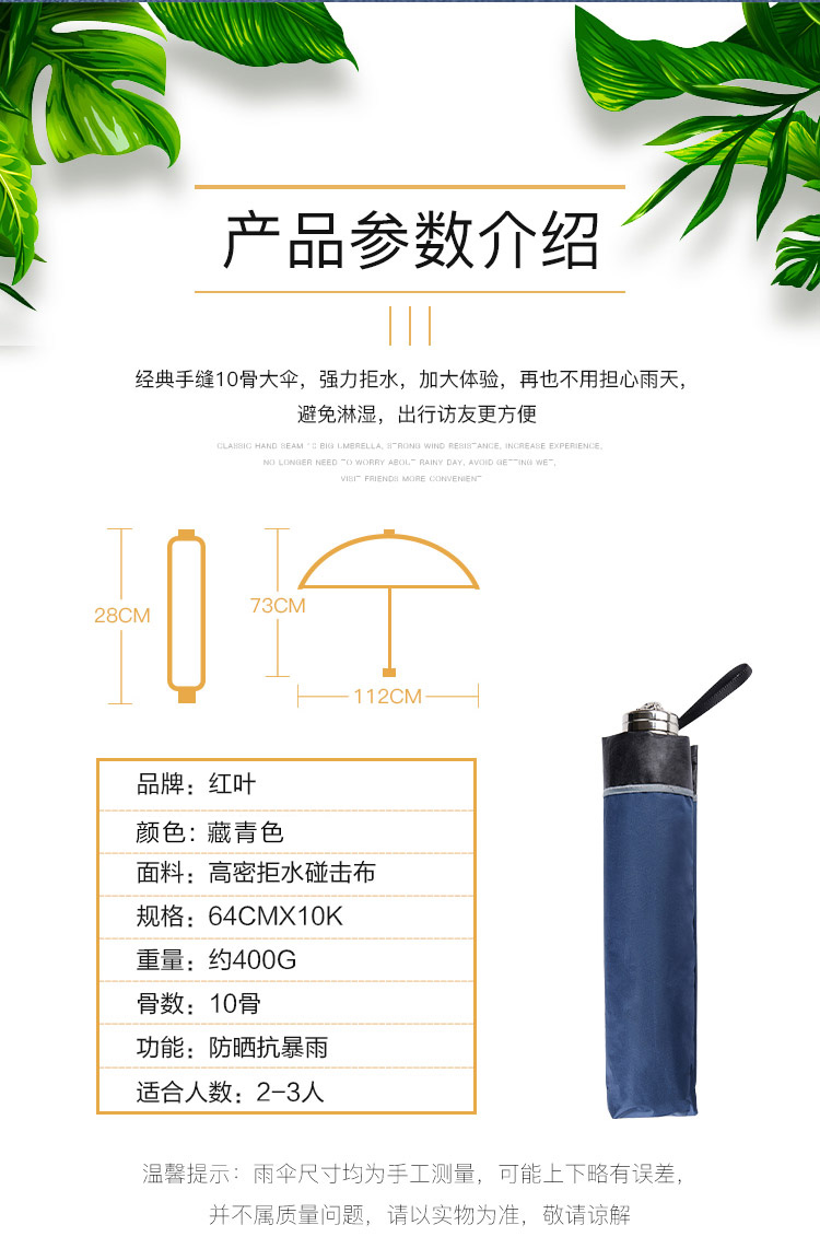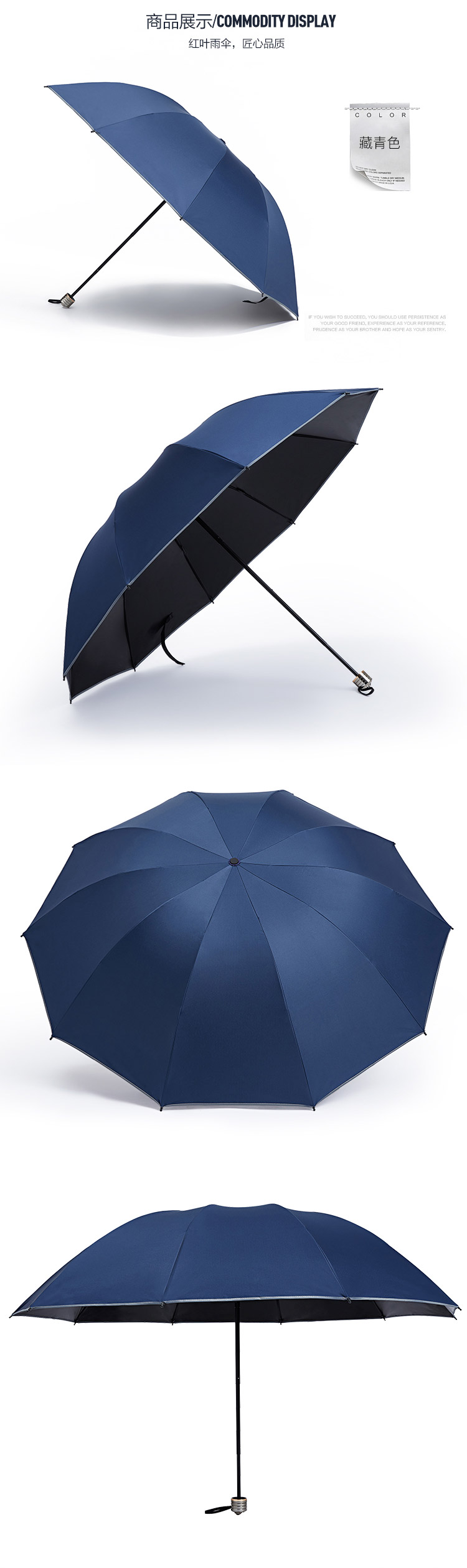 红叶雨伞 黑胶加大加固三折雨伞晴雨伞强力拒水一甩干商务伞 藏青色JD9902 蓝色